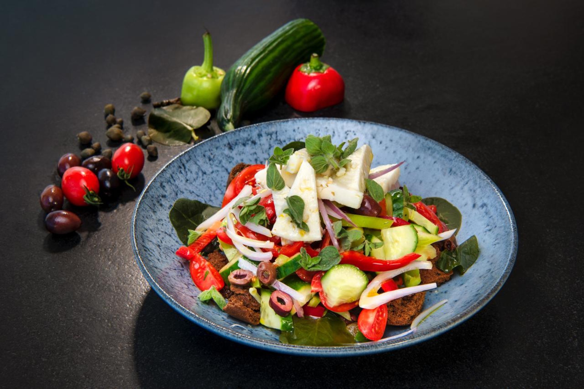 Santorinian salad with chloro Cheese from Santorini, cherry tomatoes, katsouni cucumbers, capers, peppers, onion served with virgin olive oil.