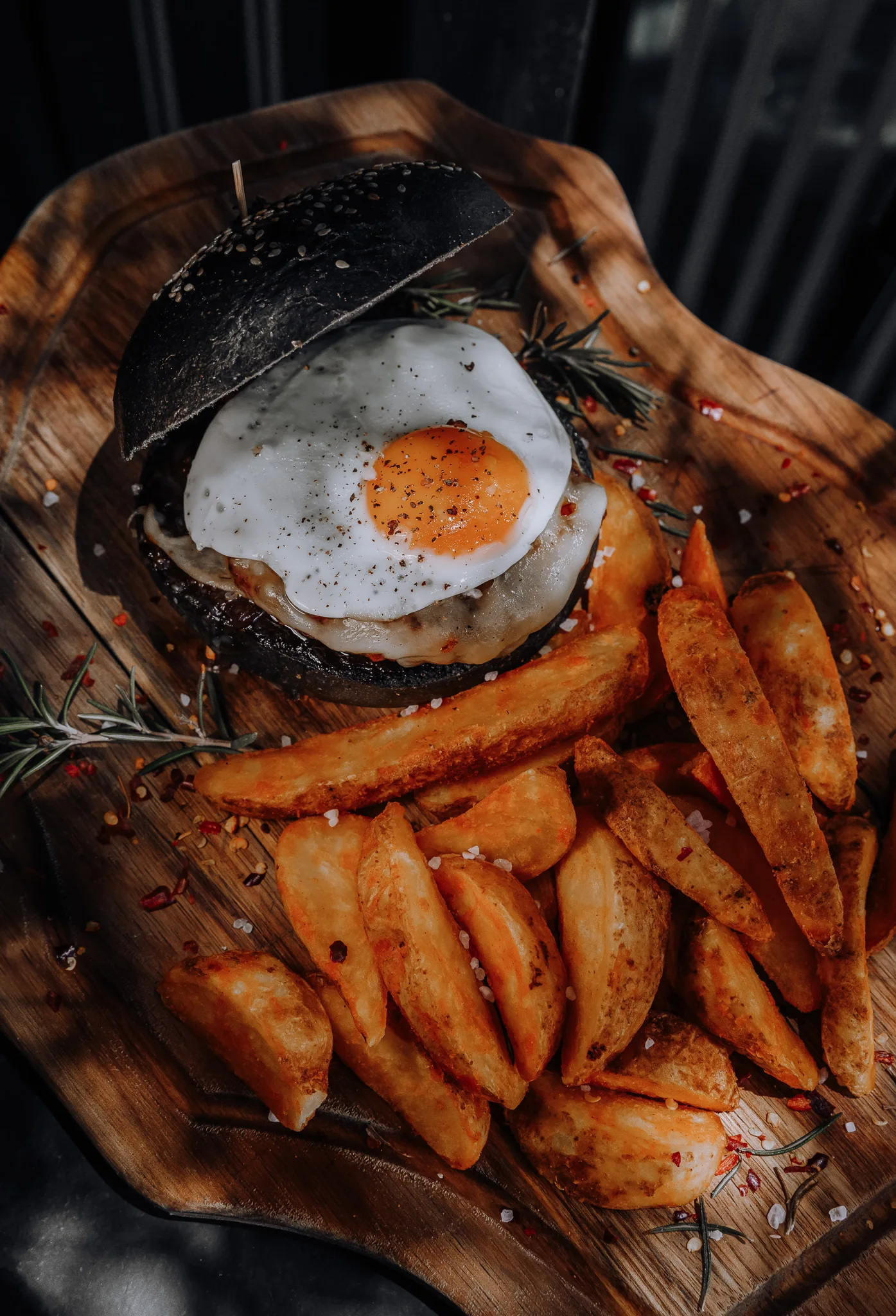 Burger on activated carbon bread with caramelized onions, fried egg, served with french fries